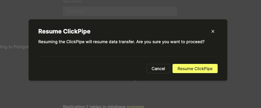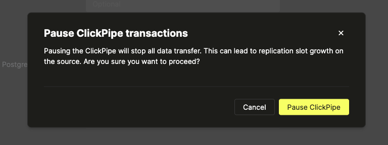 Есть сценарии, в которых полезно приостановить Postgres ClickPipe. Например, вам может потребоваться выполнить аналитические запросы по существующим данным в статическом состоянии. Или вы можете выполнять обновление Postgres. Ниже описано, как приостановить и возобновить Postgres ClickPipe.